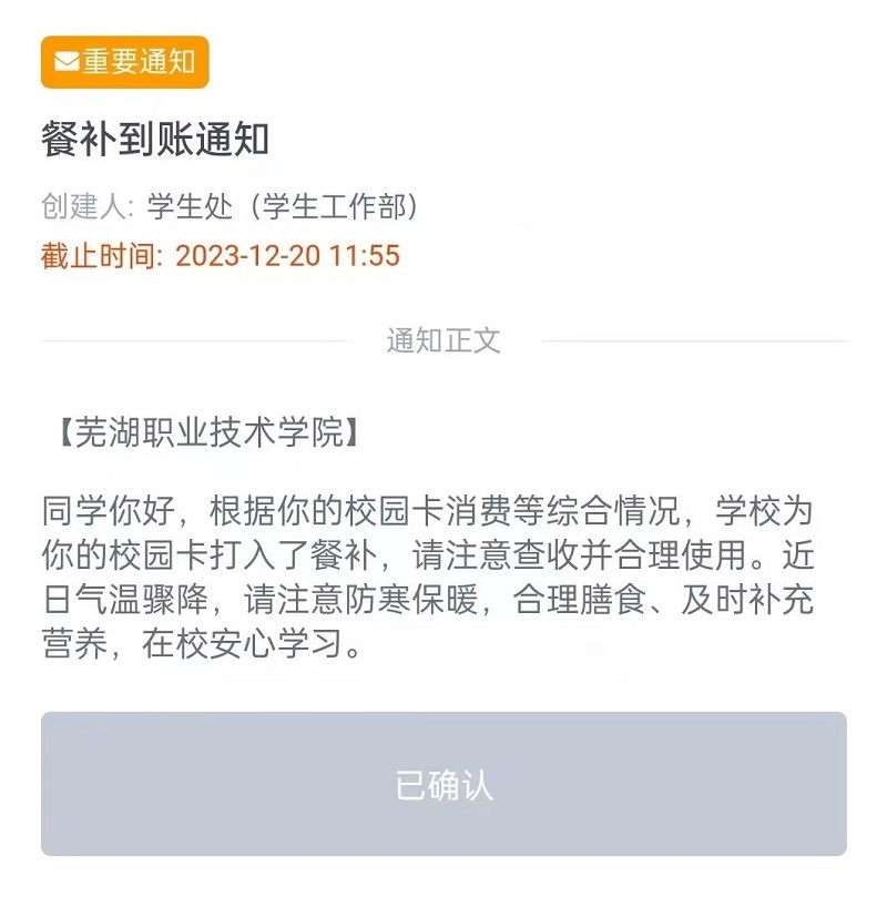为丰富学生资助工作形式,保障家庭经济困难学子安心在校学习。学校根据智慧资助平台里全校学生在食堂的就餐消费大数据,对在食堂消费次数多、每餐平均消费额度低的学生发放餐补。无需学生申请,学校确认人选后,不公布名单,悄悄打进校园卡里。