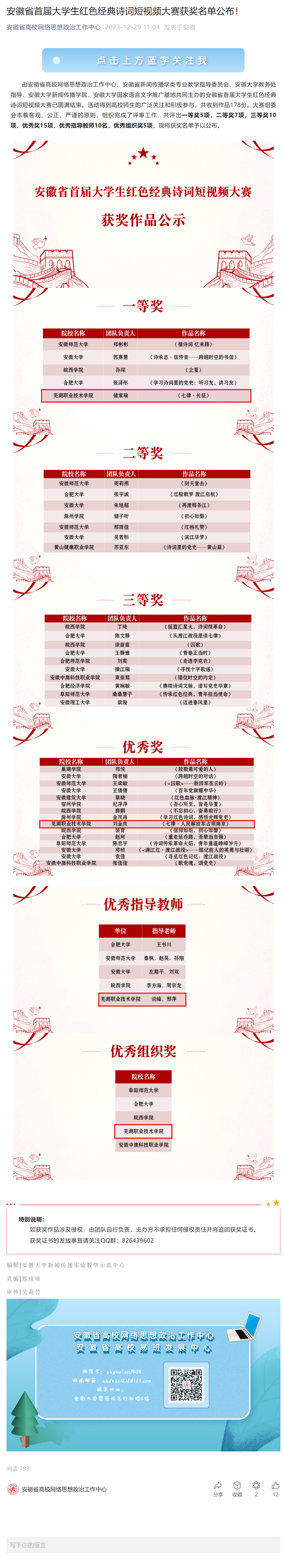 近期,由安徽省高校网络思想政治工作中心、安徽省新闻传播学类专业教学指导委员会、安徽大学教务处指导,安徽大学新闻传播学院、安徽大学国家语言文字推广基地共同主办安徽省首届大学生红色经典诗词短视频大赛圆满结束,全省共178件作品参与专家评审。我校学生处易班发展中心精心谋划,积极组织各学院报送红色经典诗词短视频作品,在本次大赛中获“优秀组织奖”称号。其中,由艺术传媒学院报送的《七律·长征》获一等奖,由马克思主义学院、人文旅游学院共同报送的《七律•人民解放军占领南京》获优秀奖,艺术传媒学院谈峰、邢萍获“优秀指导教师”称号。