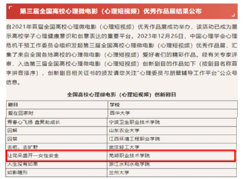 近日,由中国心理学会心理危机干预工作委员会组织发起的第三届全国高校心理微电影(心理短视频)优秀作品展经评审专家遴选公布结果,我校学生原创心理微电影《让花朵盛开--女性安全》在全国各大高校推送的参展作品中脱颖而出,斩获第三届全国高校百佳心理微电影创新剧目。