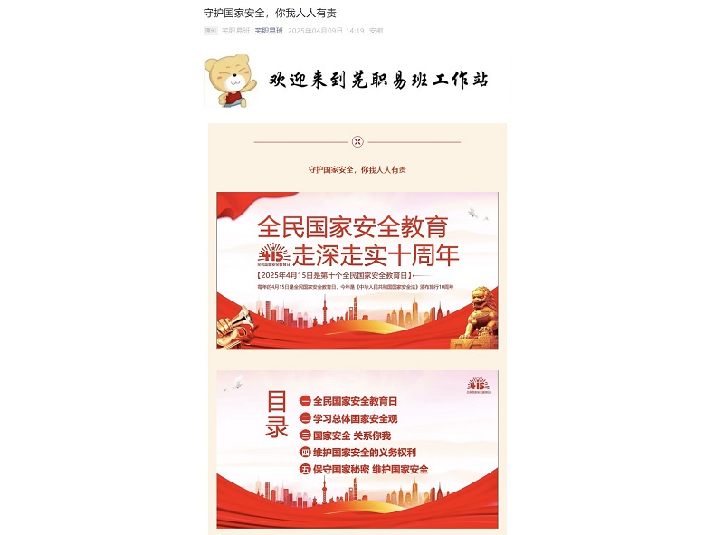 通过学生处“芜职易班”公众号等媒体平台,围绕“全民国家安全教育,走深走实十周年”主题,重点宣讲全民国家安全教育日概念、总体国家安全观内涵意义、维护国家安全权利义务以及如何保守国家秘密、维护国家安全等理论内容,转载“新发展 新安全”等宣传视频,不断夯实我校师生国家安全理论基础。