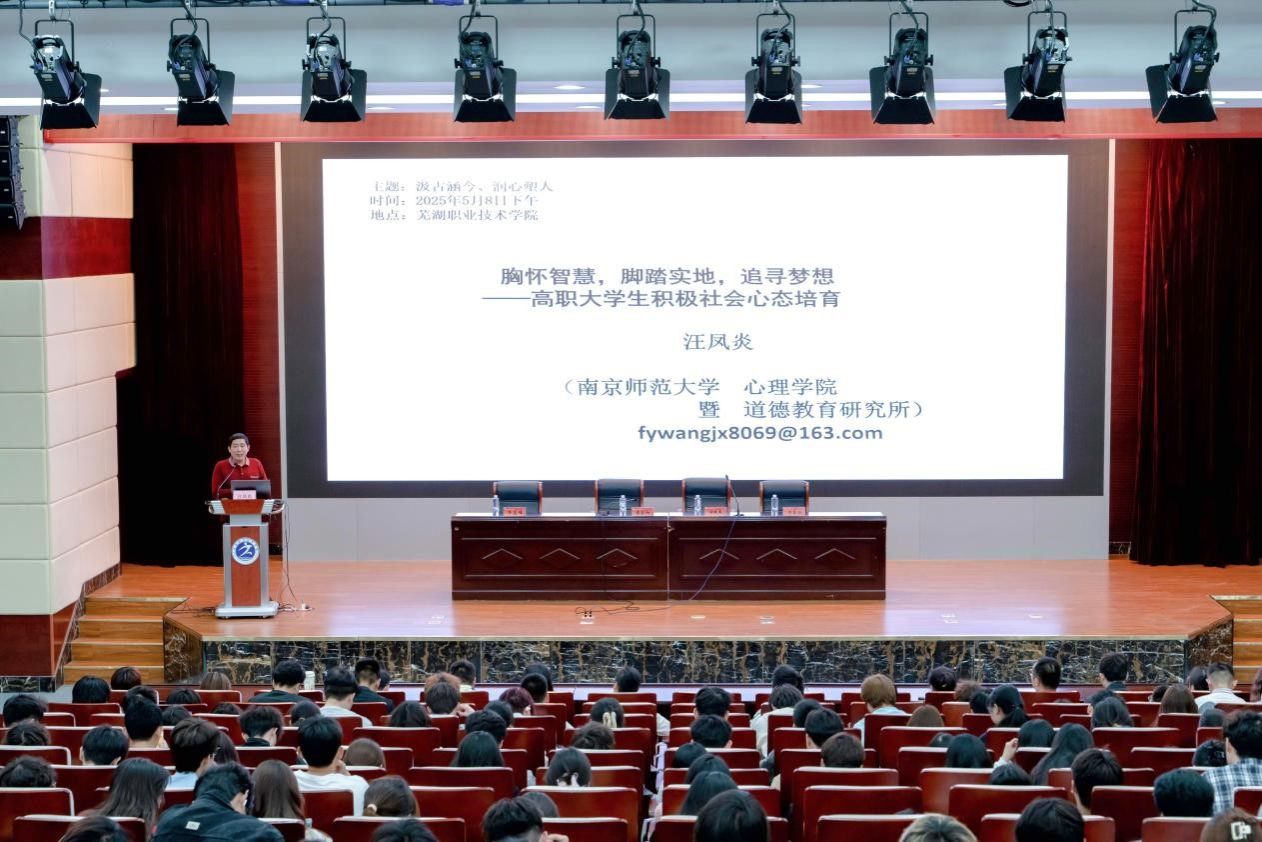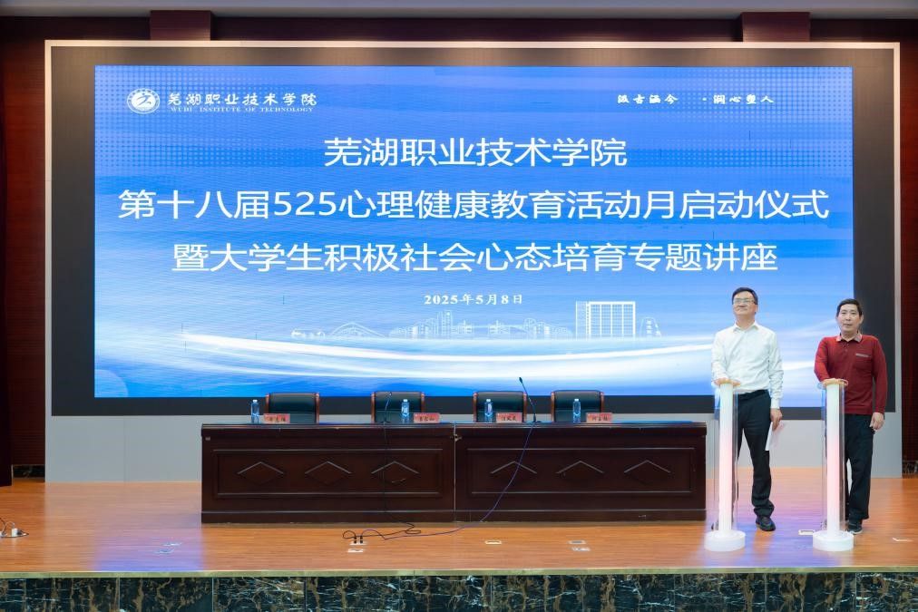 5月8日下午,芜湖职业技术学院第十八届525心理健康教育活动月启动仪式暨大学生积极社会心态培育专题讲座在图书馆学术报告厅举行。校党委副书记袁家和出席仪式,南京师范大学心理学院博士生导师、教授汪凤炎、学生处负责人及相关工作人员、各二级学院师生代表参加了仪式。