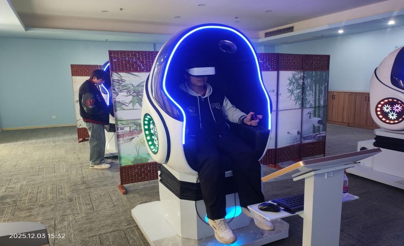 “情绪出口”区域里,学子们或戴着VR眼镜“躲进”虚拟世界,或在宣泄室把烦恼“捶进”沙袋。另一侧的“快乐互动”区同样人气高涨:剧本杀桌前,同学们拿着角色本投入演绎,时而为剧情争执、时而为反转大笑,;三国杀、狼人杀的桌边围满了人,大家在对战中打趣调侃。原本陌生的同学也很快熟络起来,现场的笑声几次盖过了游戏的讨论声。参与同学表示:“本来只是抱着试试的心态来,没想到玩着玩着,身上的烦躁感真的减轻了。”