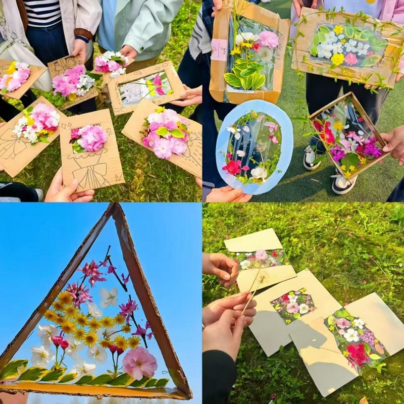 活动现场,学生们首先将提前收集的废旧快递盒裁剪成大小不一的画框,在中间留出透明的“视窗”。随后,大家在校园内自由走动,拾捡飘落的花瓣、新绿的嫩叶、纤细的草茎,将这些自然材料粘贴在透明画框的边框或视窗边缘。
