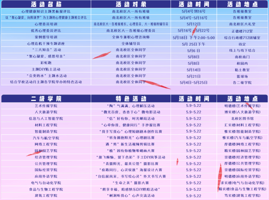 我校以“全面开展心理健康普及,全力维护学生心理健康”为宗旨,连续15届组织开展心理健康教育月活动。本届“我爱我”心理健康教育活动月期间,大学生健康成长指导中心联合各二级学院组织了心理健康主题班会比赛、母亲节专题活动--彩虹跑、心理委员培训、 淘气满满--心理减压活动等30余项(次)全校性活动。(文、图/张魁盛 审/沈绍中)