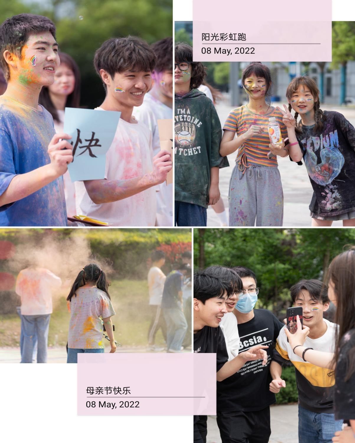 随着发令枪响,仪式第二项内容彩虹跑正式开始。彩虹跑被称为“地球上最快乐的赛跑”,在奔跑过程中同学们相互泼洒五彩虹粉,倡导“青春、自由、独立”的个性。这是不一样的奔跑,撒起炫彩的粉末,焕发彩色的光芒,当彩虹跑遇到母亲节,属于同学们的舞台也属于母亲的节日。在活动最后,同学们每人手执一支康乃馨共同摆出“母亲节快乐”的五个大字,并共颂《游子吟》,向远方的母亲表达节日祝福和感恩之情。
